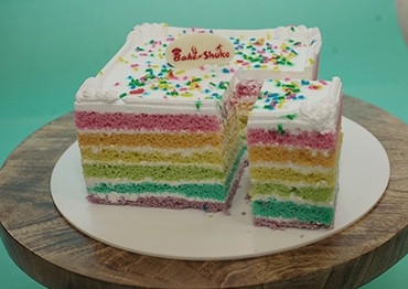 Rainbow cake is having six different layers of sponge with different colour, make your day colourful, it is an eggless cake.
